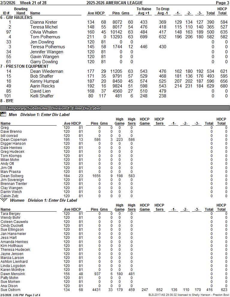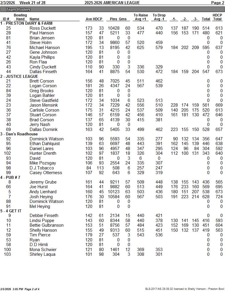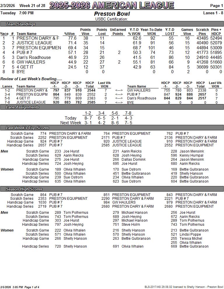 American League 2/3/2026 Week 21