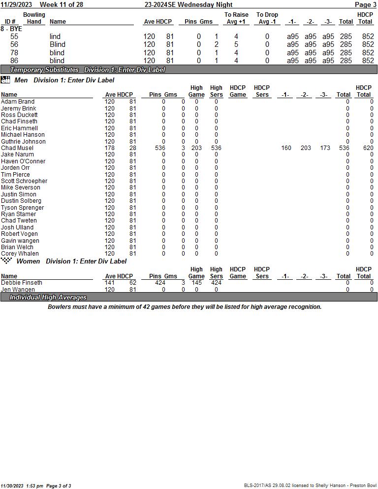 Weds. SE League Week 13 12/03/2025